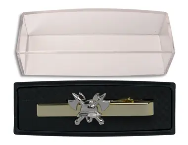 Luxusní zlatá pánská a dámská kravatová spona se stříbrnou 3D hasičskou helmou a sekerami.