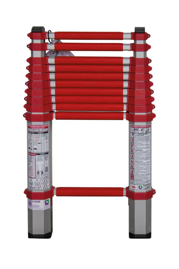 Záchranný teleskopický žebřík z hliníku podle normy DIN EN 1147. Žebřík má odolné eloxované osmihranné trubkové sloupky s tepelně izolačním, protiskluzovým plastovým povrchem (provedení DE a THW).
