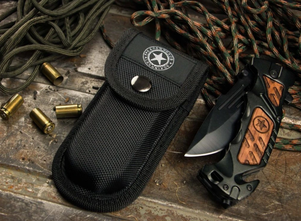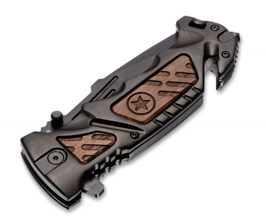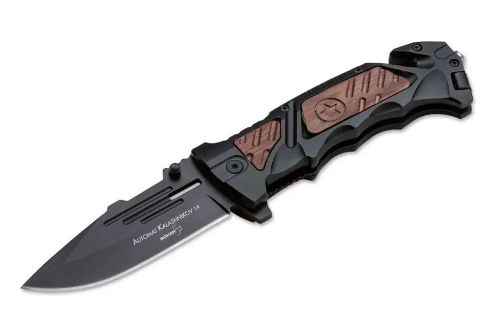 Kapesní nůž KAL-14 díky dřevěným vložkám v hliníkové rukojeti nabízí zcela jedinečný vizuální dojem. Čepel se otevírá flipperem nebo palcovým kolíčkem a je zajištěna pojistkou linerlock. Výbavu doplňuje rozbíječ skla a řezač pásů. Čepel je vyrobena z oceli 440C. Nůž je dodáván s nylonovým pouzdrem na opasek.
