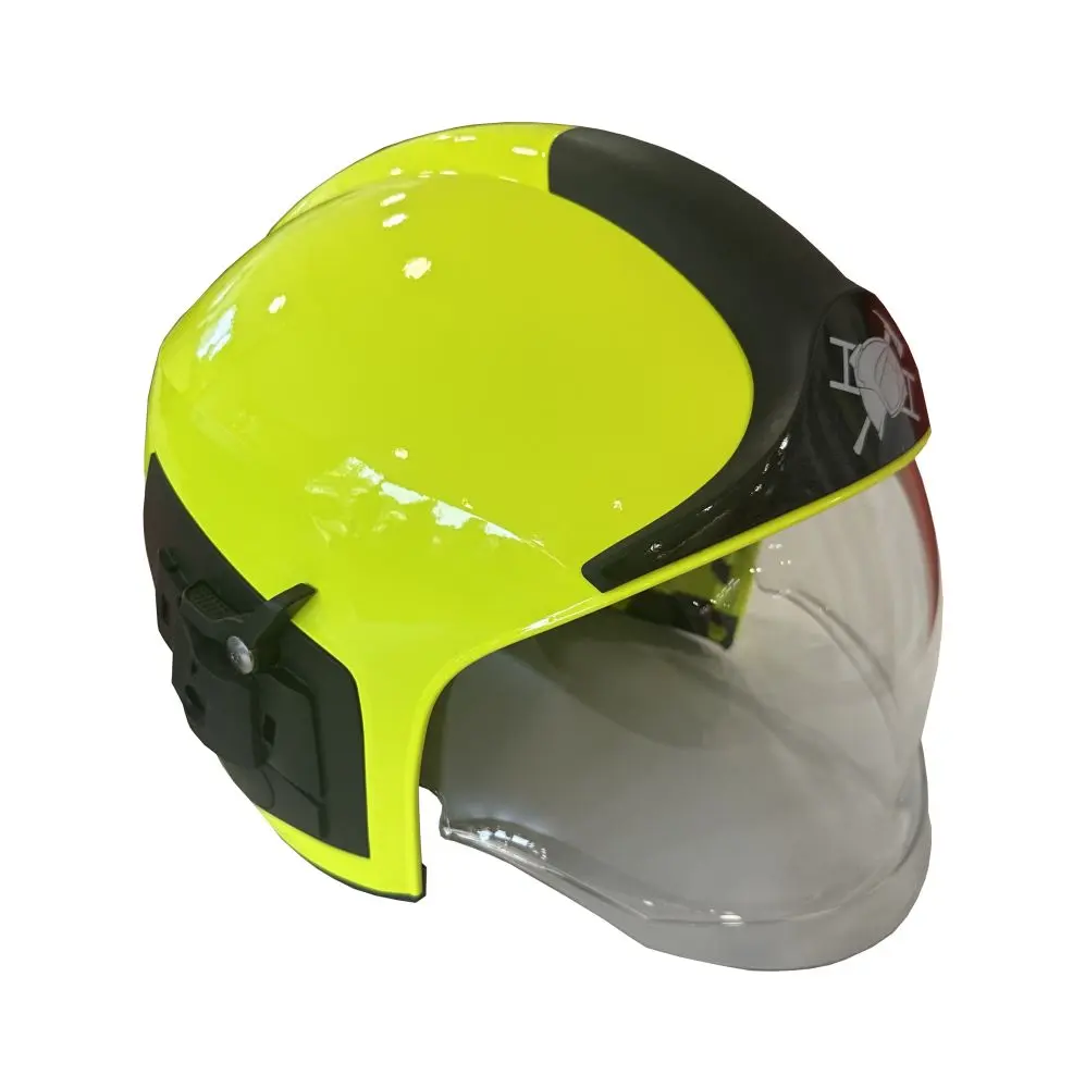 Přilba HPS 7000 PRO s čirým integrovaným zorníkem pro ochranu obličeje, s fixací do protichemických obleků s ochrannými brýlemi, vybavená čelním štítkem s adaptéry pro masky s rychloupínáky a volitelnými doplňky pro montáž externí svítilny nebo integrovanou přilbovou svítilnu HPS 7000.