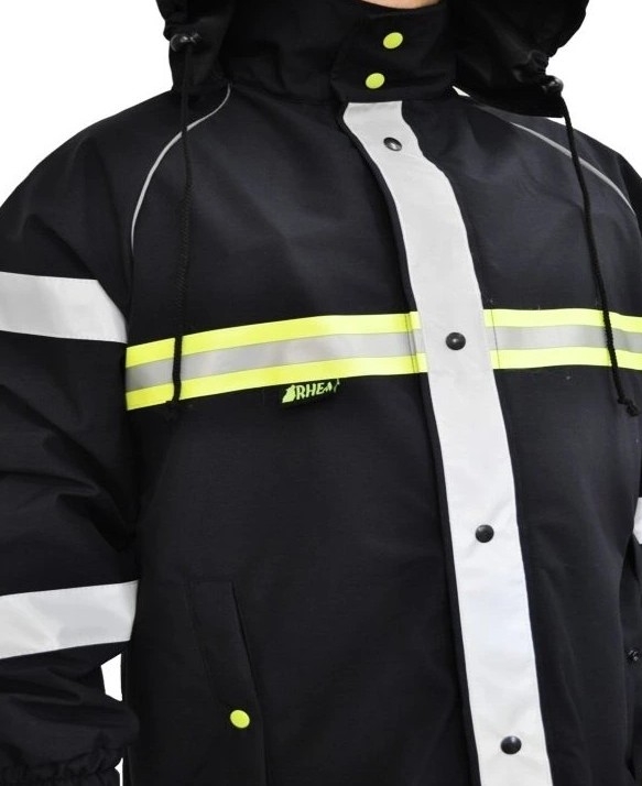 Bunda je vyrobena z odolné PES tkaniny s gumozáterem, má kapuci skrytou v límci a praktické zapínání na pevné nýty. Rukávy jsou zakončeny pružnou gumou. Dvojité zádové sedlo s větráním napomáhá lepší cirkulaci vzduchu. Boční „falešné“ kapsy umožňují snadný přístup ke spodnímu oděvu.