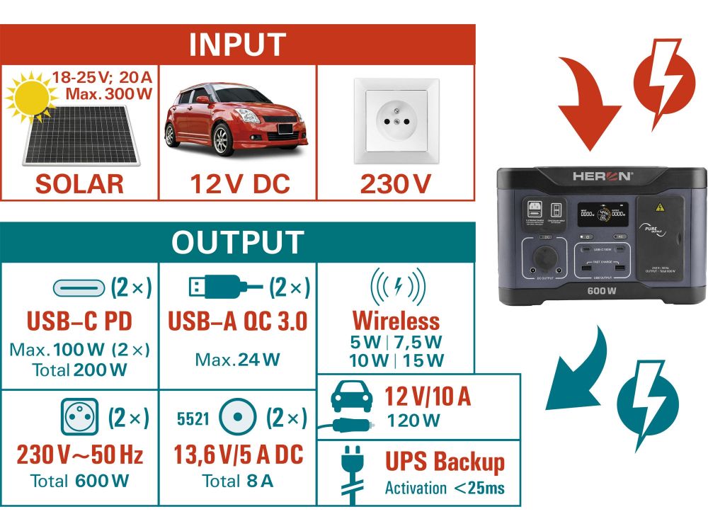 Stanice je vybavena dvěma výstupy USB-C (podporujícími Power Delivery), dvěma výstupu USB-A (podporujícími QuickCharge), DC porty, bezdrátovým nabíjením a dvěma 230V zásuvkami, což z ní dělá univerzálního pomocníka. Snadno vám nabije smartphone, tablet, notebook, fotoaparát nebo bude napájet lednici, projektor i menší nářadí. Inteligentní řídicí systém automaticky rozpozná typ zařízení a optimalizuje výkon, aby bylo nabíjení rychlé a šetrné.