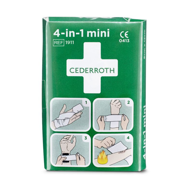 Obvaz mini k zastavení krvácení 4v1 Cederroth je sterilní univerzální obvaz, který se skládá ze dvou elastických obvazů a jednoho obkladu s nepřilnavou vrstvou. Obklad je přišit k jednomu z obvazů. Obvaz je zabalen do sáčku s tištěnými obrazovými pokyny první pomoci.