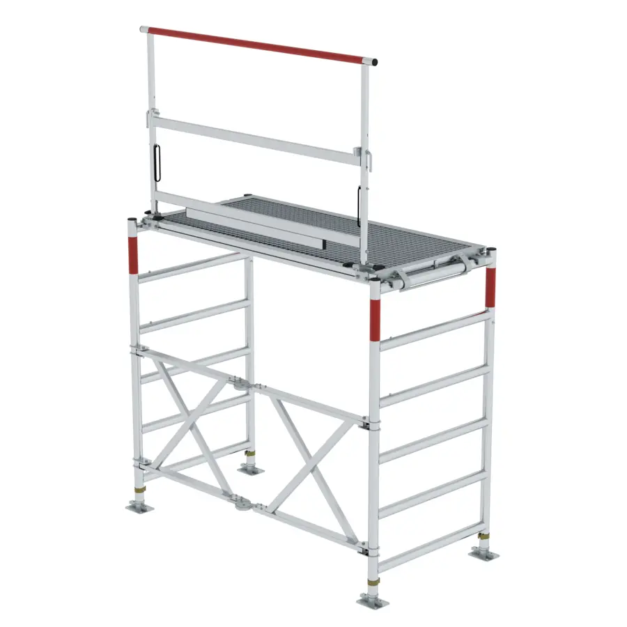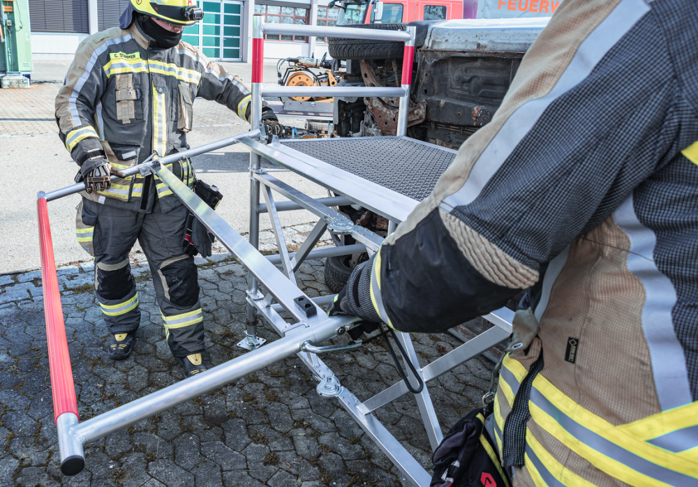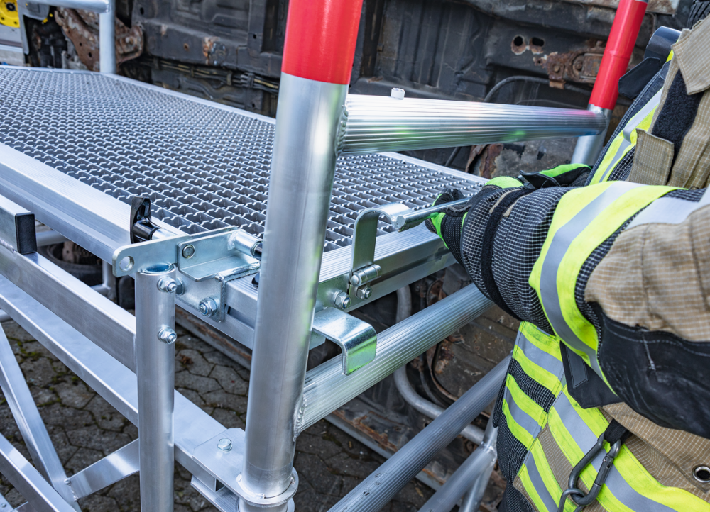 Plošina je vyrobena ze stabilního hliníku a je vybavena protiskluzovým roštem s třídou protiskluznosti R 12, což zajišťuje vysokou bezpečnost i při nepříznivých podmínkách. Její výška je nastavitelná po jednotlivých stupních, takže ji lze snadno přizpůsobit aktuálním potřebám zásahu.