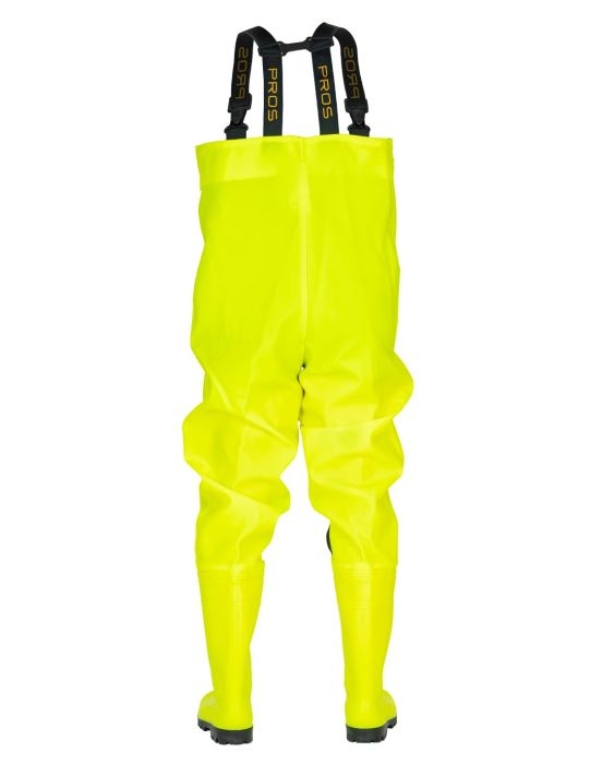 Hrudní brodící kalhoty MAX FLUO s obuví mají fluorescenční barvu pro lepší viditelnost.